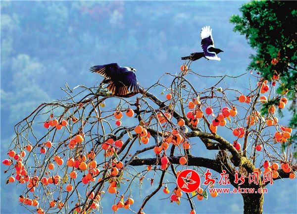 一次在漢濱區(qū)茨溝鎮(zhèn)西溝村拍鳥,當時正值秋收時節(jié),柿子樹上掛滿了熟透的柿子。張東風(fēng)看到兩位農(nóng)民在摘柿子,但是他們并沒有把樹上的柿子全部摘完,而是留了一些紅彤彤的柿子掛在樹上。