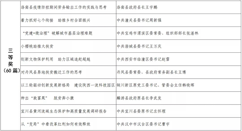 據(jù)悉,全省黨政領(lǐng)導干部優(yōu)秀調(diào)研成果評選工作迄今已開展了18年。本次評選活動從全省市縣兩級和省級各部門上報的487篇縣處級以上黨政領(lǐng)導干部調(diào)研報告中,評出獲獎優(yōu)秀調(diào)研成果120篇。其中,《陜西農(nóng)民增收路徑研究》等15篇獲一等獎,《關(guān)于推進住房公積金事業(yè)高質(zhì)量發(fā)展的調(diào)研報告》等45篇獲二等獎,《后疫情時期我國糧食安全潛在風險與應(yīng)對》等60篇獲三等獎。