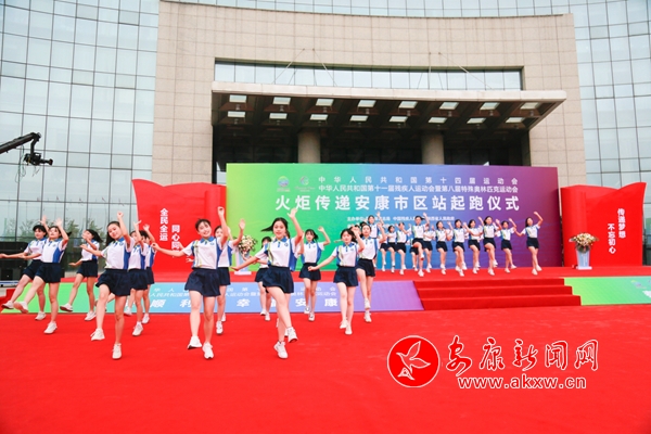 暖場節(jié)目漢劇歌舞《春色滿園樂安康》和安康高新中學學生表演的健身操《天天向上》,點燃了現場喜慶的氣氛。上午8時,火炬?zhèn)鬟f起跑儀式正式開始。4名國旗護衛(wèi)禮兵高舉中華人民共和國國旗,邁著整齊有力的步伐進入儀式現場,全場齊聲同唱《中華人民共和國國歌》,嘹亮的旋律激蕩人心、催人奮進。