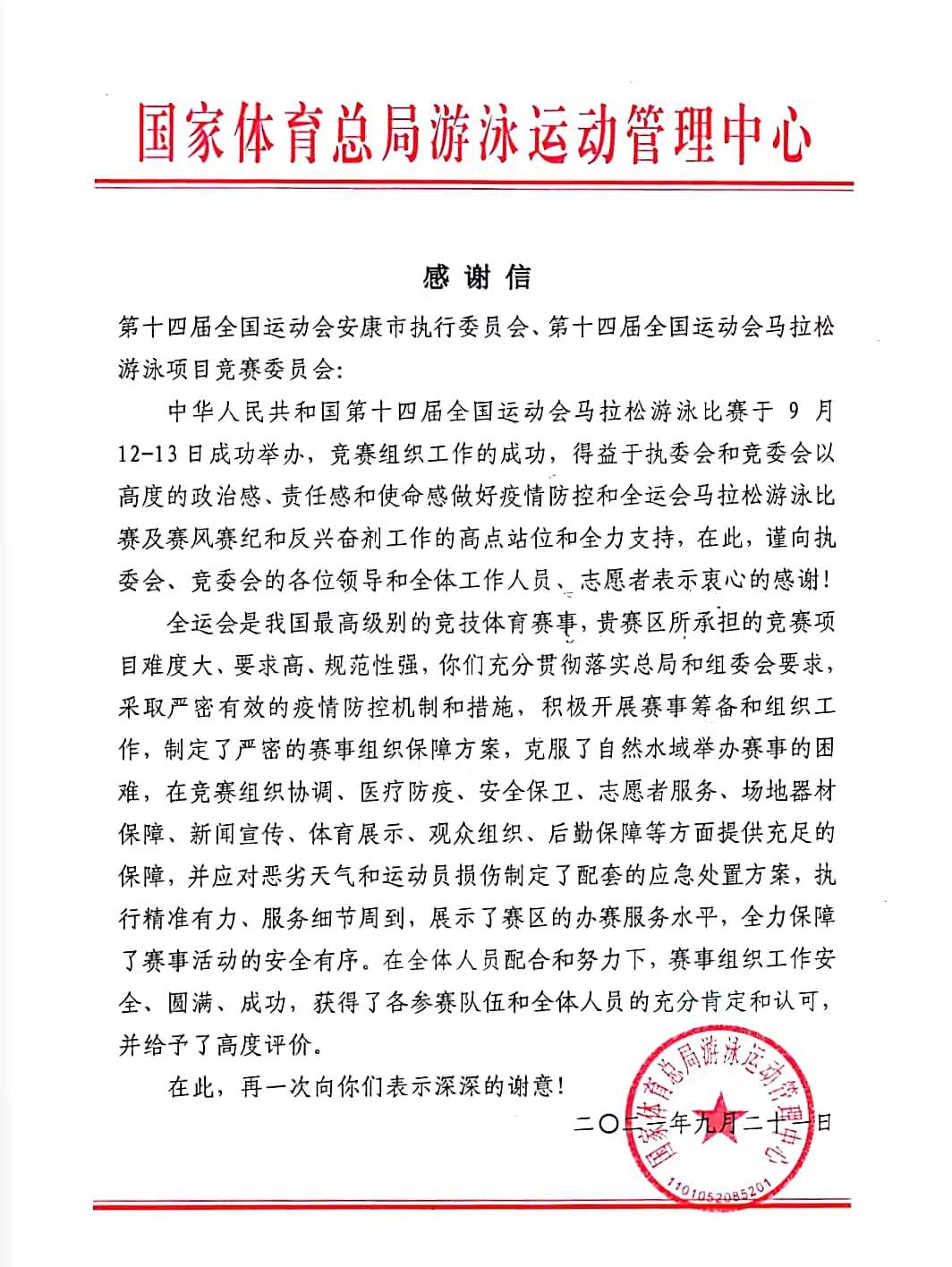 9月12日至13日,十四運(yùn)會(huì)馬拉松游泳比賽在我市成功舉辦,賽事精彩、圓滿,得到了各方好評(píng)。國(guó)家體育總局游泳運(yùn)動(dòng)管理中心在向“第十四屆全國(guó)運(yùn)動(dòng)會(huì)安康市執(zhí)行委員會(huì)、第十四屆全國(guó)運(yùn)動(dòng)會(huì)馬拉松游泳項(xiàng)目競(jìng)賽委員會(huì)”發(fā)來(lái)的這封感謝信中說,“競(jìng)賽組織工作的成功,得益于執(zhí)委會(huì)和競(jìng)委會(huì)以高度的政治感、責(zé)任感和使命感,做好疫情防控和全運(yùn)會(huì)馬拉松游泳比賽及賽風(fēng)賽紀(jì)和反興奮劑工作的高點(diǎn)站位與全力支持,在此,謹(jǐn)向執(zhí)委會(huì)、競(jìng)委會(huì)的各位領(lǐng)導(dǎo)和全體工作人員、志愿者表示衷心的感謝!”