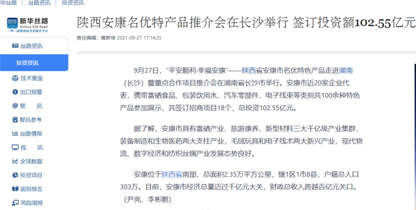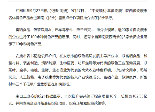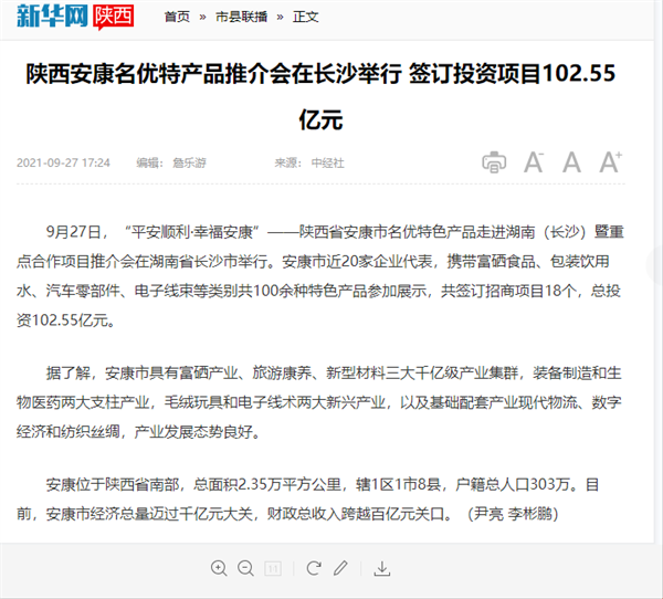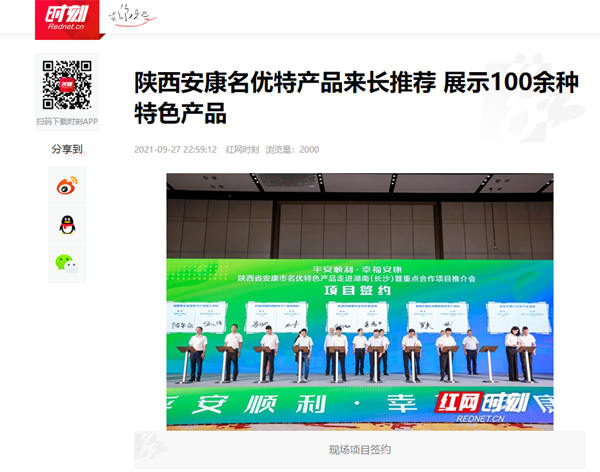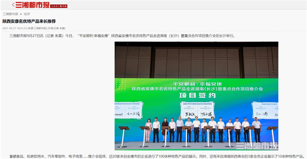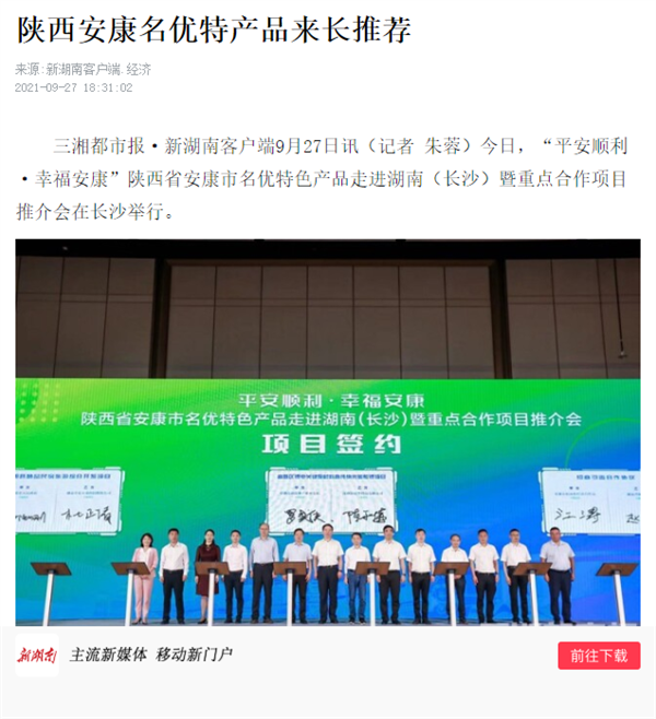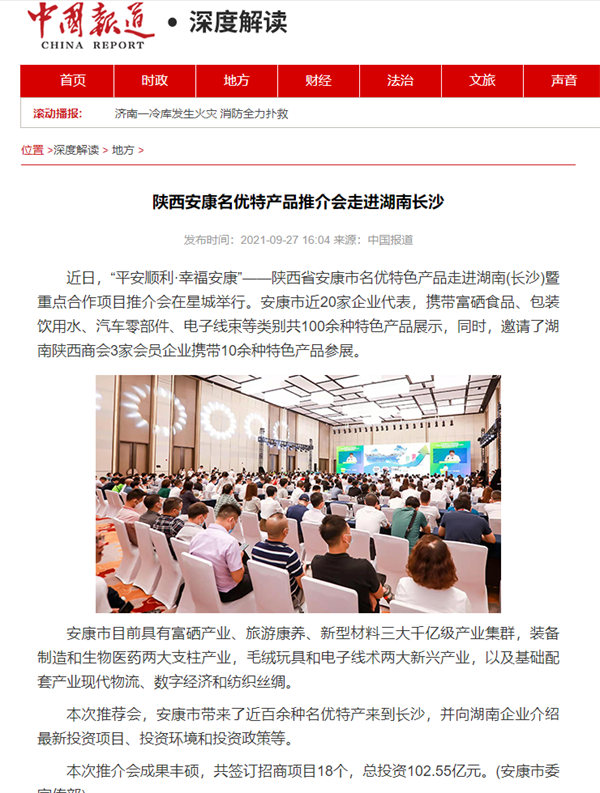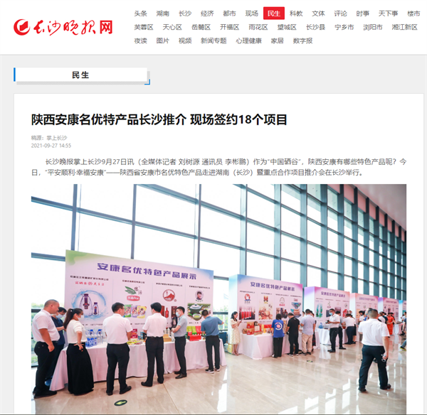 本網(wǎng)訊 9月27日,由中共安康市委、安康市人民政府,陜西省商務(wù)廳聯(lián)合主辦的“平安順利·幸福安康——陜西省安康市名優(yōu)特色產(chǎn)品走進(jìn)湖南(長(zhǎng)沙)暨重點(diǎn)合作項(xiàng)目推介會(huì)”在長(zhǎng)沙市成功舉辦。新華社、中國交通廣播、中國報(bào)道、湖南日?qǐng)?bào)、長(zhǎng)沙晚報(bào)、三湘都市報(bào)、國際在線、紅網(wǎng)等中省、長(zhǎng)沙以及駐長(zhǎng)多家媒體紛紛給予報(bào)道。媒體不僅高度贊揚(yáng)兩地的合作成果,并對(duì)安康有了一個(gè)嶄新的評(píng)價(jià)和認(rèn)識(shí)。一起看看“老親戚”長(zhǎng)沙眼中的“老鄰居”安康是什么樣!