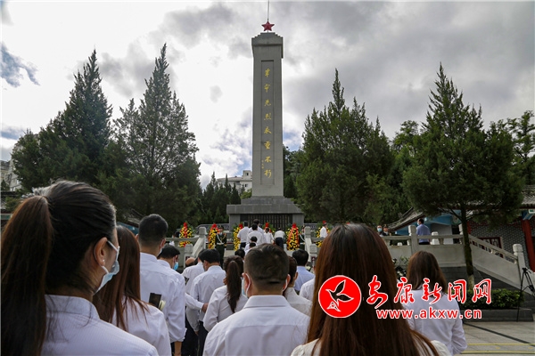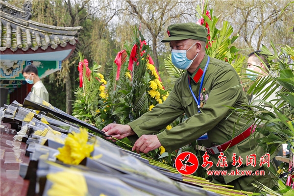 隨后,《獻(xiàn)花曲》奏響,禮兵列隊(duì)入場(chǎng),將花籃整齊擺放在紀(jì)念碑基座上。趙俊民拾級(jí)而上緩步行至紀(jì)念碑前,仔細(xì)整理花籃緞帶,全體人員向革命烈士三鞠躬,表達(dá)緬懷之情。參加活動(dòng)的市級(jí)領(lǐng)導(dǎo)和各界代表也依次敬獻(xiàn)鮮花并瞻仰烈士紀(jì)念碑。