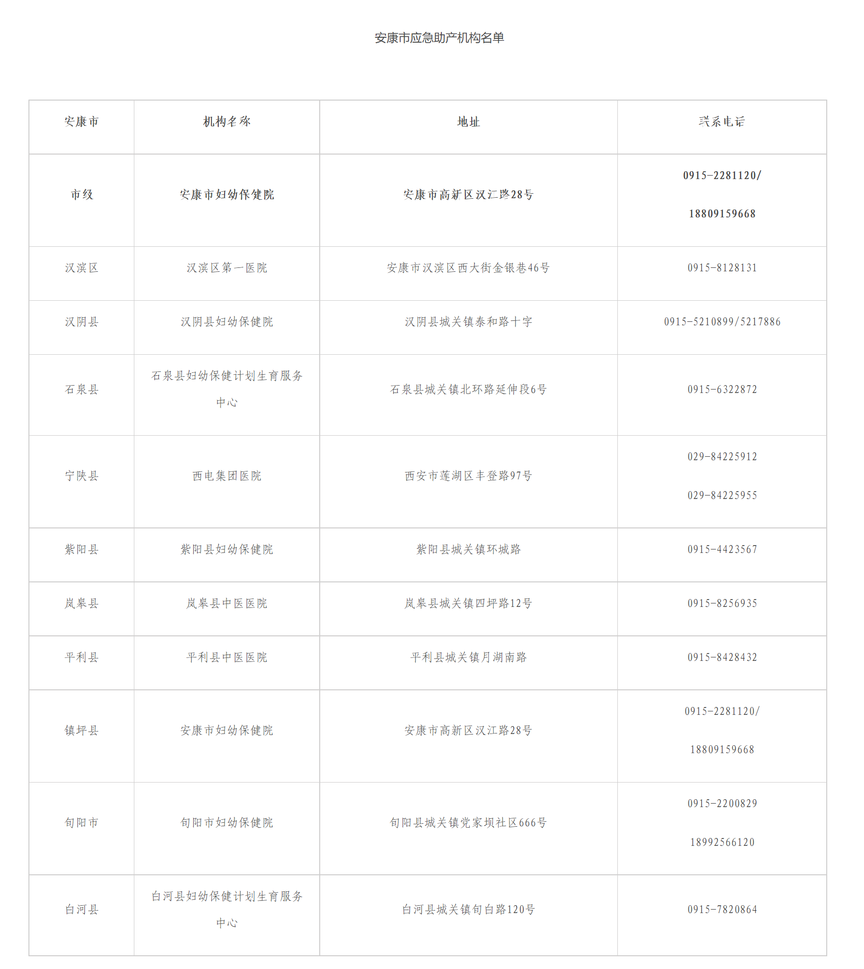 為全面落實新冠疫情防控工作要求,全力保障婦女兒童生命安全與身體健康,安康市衛(wèi)健委匯總各縣(市、區(qū))上報名單,確定了10家應(yīng)急助產(chǎn)機構(gòu),用于應(yīng)急承接普通孕產(chǎn)婦產(chǎn)檢和住院分娩相關(guān)服務(wù)。