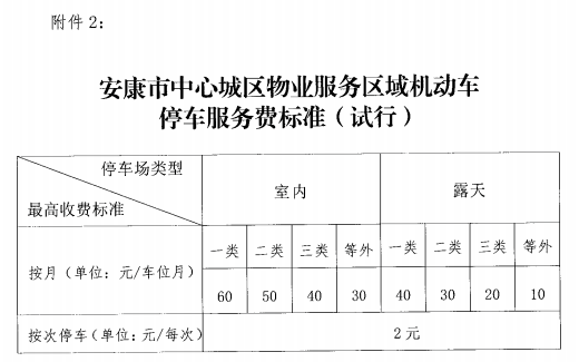 2、《安康市中心城區(qū)物業(yè)服務(wù)區(qū)域機(jī)動車停車服務(wù)費(fèi)標(biāo)準(zhǔn)》(試行)。