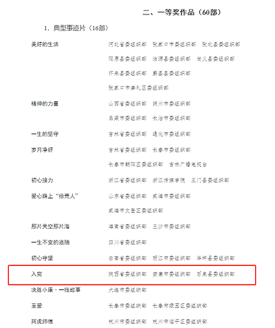 我省共有8部作品榮膺上榜,由安康市委組織部與石泉縣委組織部聯(lián)合拍攝的《入黨》榮獲典型事跡片觀摩評(píng)比一等獎(jiǎng),也是全省唯一1部獲得一等獎(jiǎng)的作品。