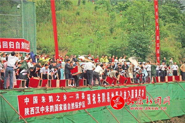 2007年5月31日,中國(guó)陜西朱鹮野化放飛儀式正式在寧陜縣寨溝村舉行。中省領(lǐng)導(dǎo)出席了放飛儀式,并打開(kāi)鳥(niǎo)籠,一起放飛了20只朱鹮,隨后,放飛基地的技術(shù)人員、寧陜縣的群眾代表和學(xué)生代表又放飛6只。隨著放飛的朱鹮翱翔藍(lán)天,標(biāo)志著朱鹮保護(hù)由單純的人工搶救開(kāi)始轉(zhuǎn)向回歸自然的新階段,朱鹮搶救保護(hù)的歷史掀開(kāi)了新的一頁(yè)。