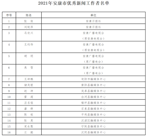 擬授予張俊等16名同志“安康市優(yōu)秀新聞工作者”榮譽(yù)稱(chēng)號(hào)。