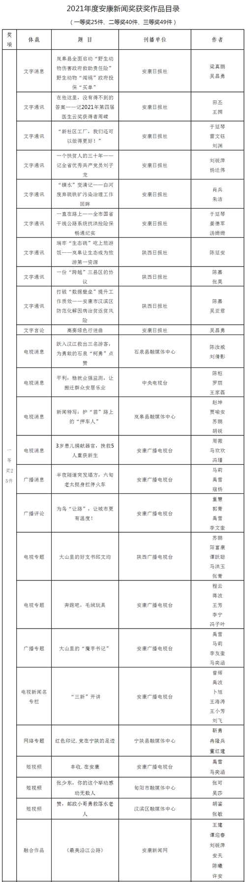 2021年度安康新聞獎(jiǎng)評(píng)審工作在中共安康市委宣傳部的指導(dǎo)下,由市記協(xié)具體組織實(shí)施,經(jīng)過(guò)各申報(bào)單位推薦,市記協(xié)初審、復(fù)審并組織專(zhuān)家定評(píng),評(píng)選出擬獲安康新聞獎(jiǎng)作品114件,其中一等獎(jiǎng)25件、二等獎(jiǎng)40件、三等獎(jiǎng)49件。
