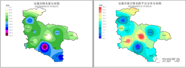 6月1-30日,安康全市平均降水量102.2 毫米,較常年同期偏少21%,各縣(區(qū)、市)降水量48.6~171.7毫米,全市大部地區(qū)降水量與常年同期相比偏少14.17%~62.06%。