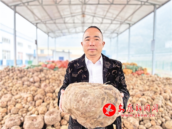 車子拐進(jìn)位于六口的工業(yè)園區(qū),潤(rùn)福源魔芋發(fā)展有限公司的廠房地面上,堆滿了剛剛收來的魔芋,6個(gè)碩大的魔芋被整齊地?cái)[成一排,記者抱起其中一個(gè),沉甸甸的重量在手中向下墜。