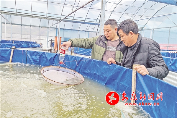 在石泉縣城關(guān)鎮(zhèn)楊柳社區(qū)高密度水產(chǎn)養(yǎng)殖基地,技術(shù)人員正在耐心查看南美對(duì)蝦生長(zhǎng)情況。董長(zhǎng)松 攝