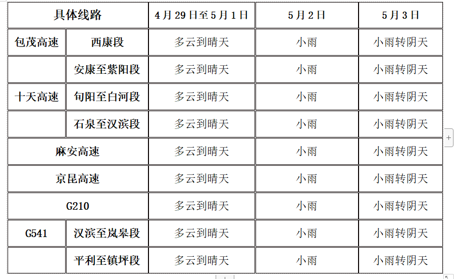 “五一”前期,前期天氣相對(duì)適宜出行,后期受降水天氣影響,包茂高速、麻安高速、十天高速、G541等路段需注意低能見(jiàn)度及道路濕滑對(duì)交通安全的不利影響,出行注意安全,另外返程期間可能出現(xiàn)交通擁堵,出行需提前規(guī)劃好路線以免受到影響。