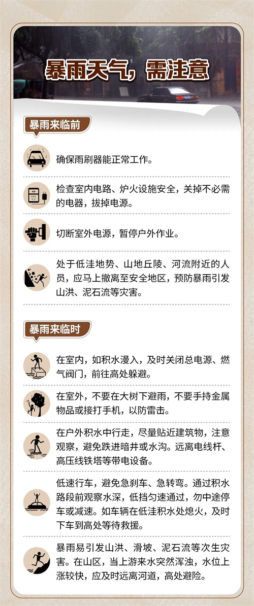 如果暴雨來襲,你知道應該注意哪些安全事項嗎?處于低洼地段,在門口放置擋水板;一旦家中進水,第一時間關電閘;雨天出行,注意腳下坑洞……