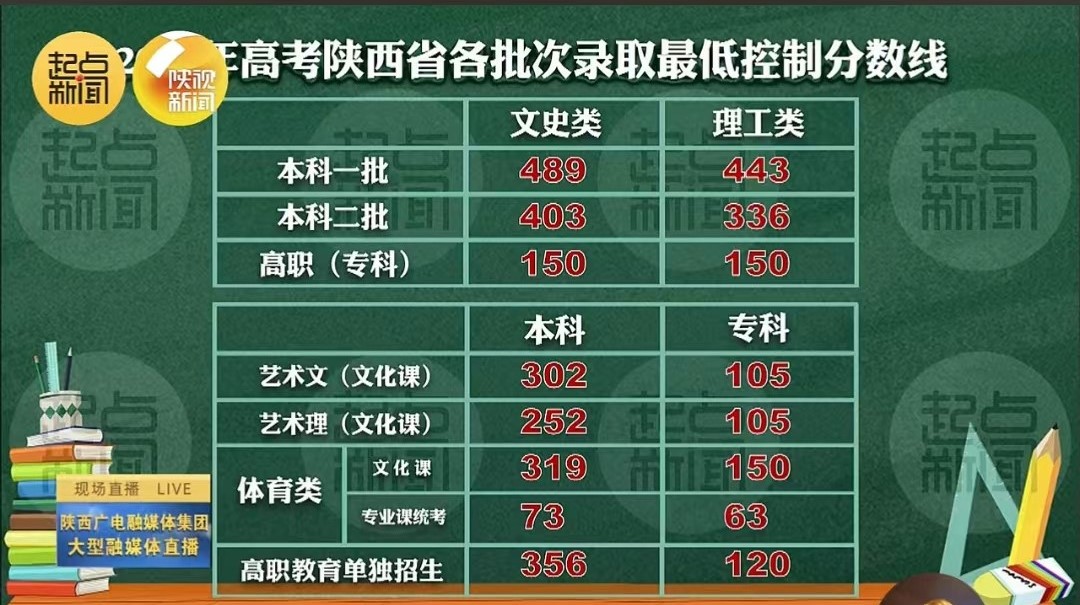 本網(wǎng)訊 6月24日,據(jù)2023年陜西省高考各批次錄取分?jǐn)?shù)線新聞發(fā)布會(huì)公布,陜西的文史類分?jǐn)?shù)線,本科一批489分、二批403分、?疲ǜ呗殻┡150分;理工類分?jǐn)?shù)線本科第一批為443分、第二批336分、?疲ǜ呗殻┡150分。