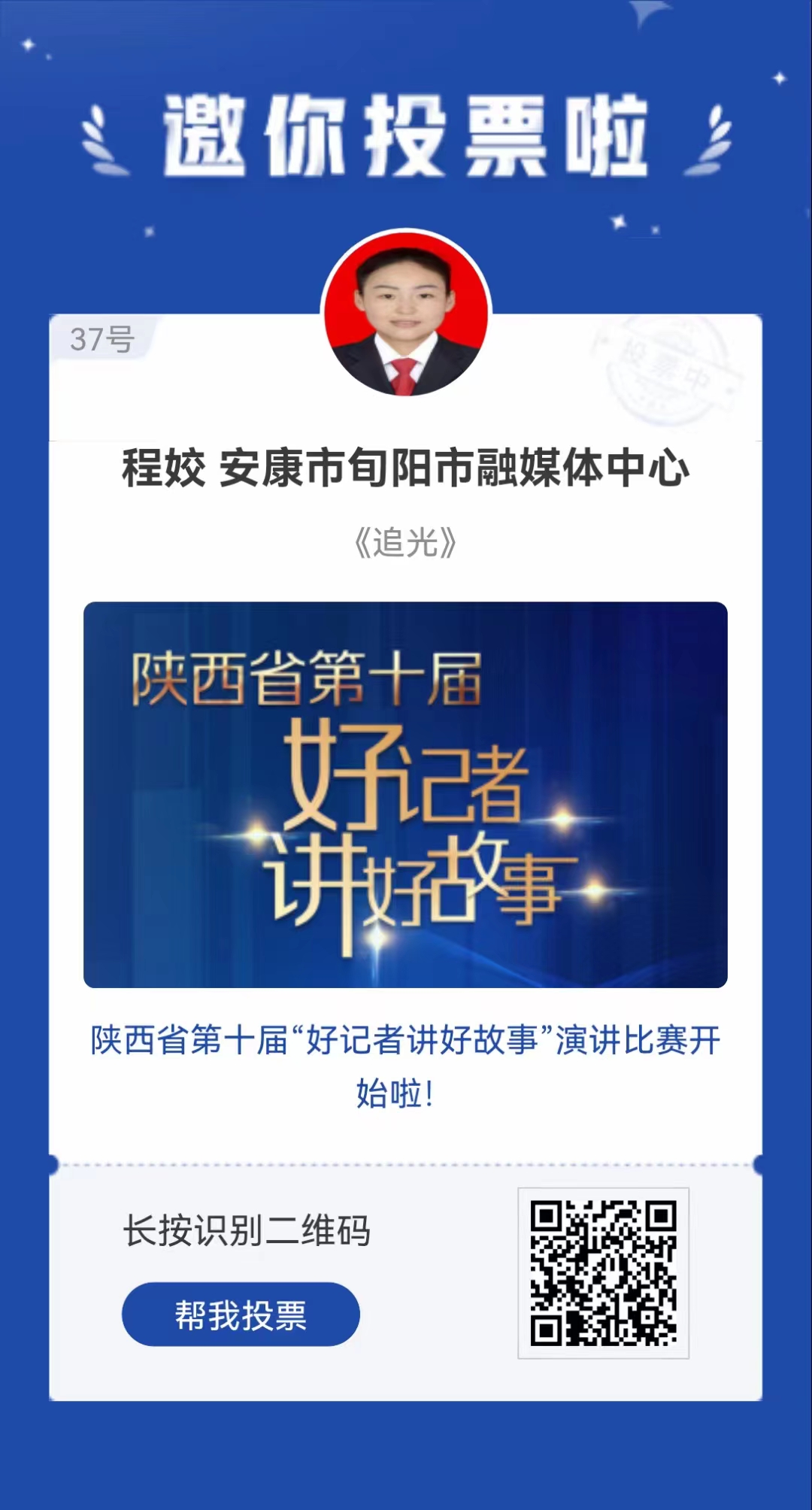 陜西省第十屆“好記者講好故事”活動決賽開幕在即。7月26日,陜西省新聞工作者協(xié)會開通投票通道,由我市推薦的旬陽市融媒體中心程姣(故事作品《追光》)順利入圍。
