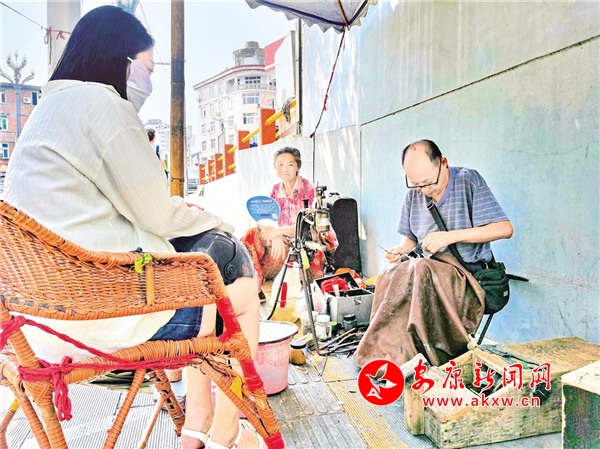 “一天能掙個(gè)幾十元也不錯(cuò),總比閑著在家里啥事不干強(qiáng)。”趙正根說(shuō),有了這個(gè)攤位,自己有事干,大家也有個(gè)聯(lián)絡(luò)點(diǎn),也沒(méi)指望能在這個(gè)攤上掙多少錢(qián),所以收費(fèi)要比別的地方便宜。就拿換一對(duì)童鞋上的魔術(shù)貼來(lái)說(shuō),自己只收四五元,別的地方可能就要貴一些,釘偏掌我這里收5元,魔刀也是5元,畢竟人家都是拖家?guī)Э诘,自己只是順手,別人方便,自己也不無(wú)聊。