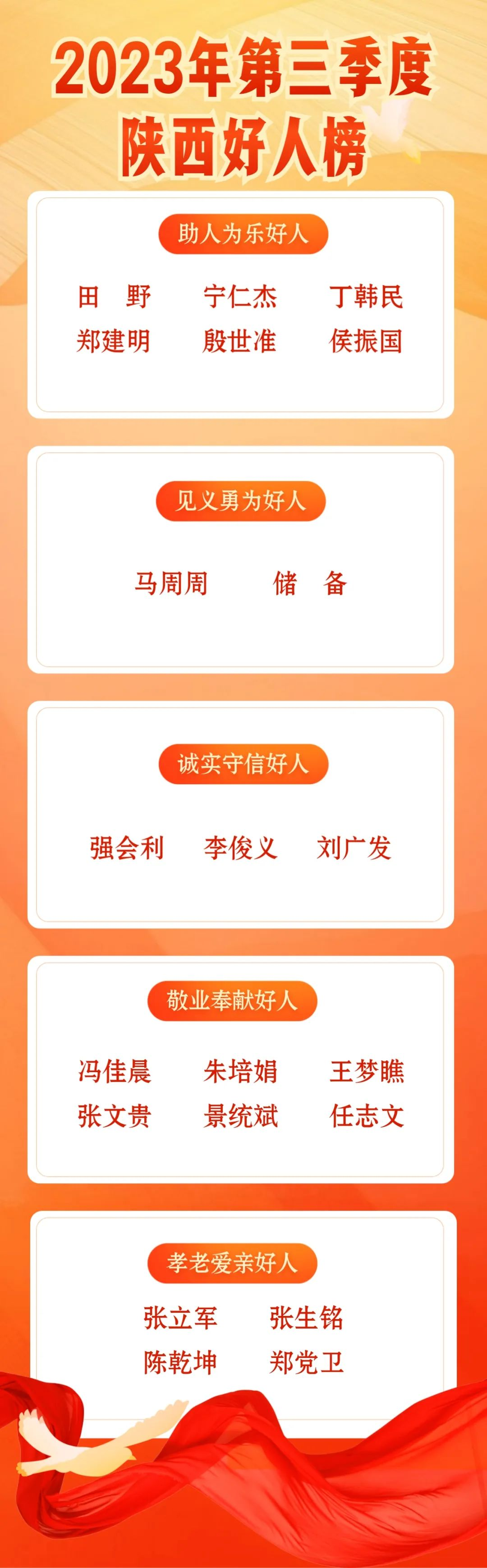 10月13日,2023年第三季度陜西好人榜發(fā)布儀式暨“奮進新時代 聚力譜新篇”新時代文明實踐展演活動在榆林陽光廣場舉行。此次共有田野、強會利、馮佳晨等21名身邊好人登上第三季度“陜西好人榜”。其中,我市儲備、陳乾坤2人分別入選2023年第三季度“陜西好人榜”名單見義勇為好人、孝老愛親好人。