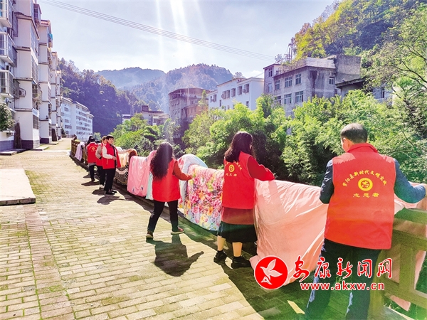 紫陽(yáng)縣高橋鎮(zhèn)桂花樹社區(qū)組織新時(shí)代文明實(shí)踐志愿者服務(wù)隊(duì),幫助社區(qū)行動(dòng)不便的獨(dú)居老人、殘疾人曬被子、裝過冬棉被。胡波 王順勤 攝