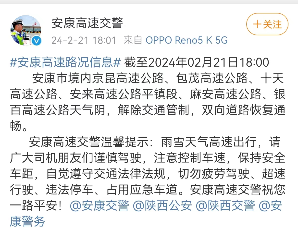 2月21日18時,安康高速交警發(fā)布消息:截至2024年02月21日18:40,安康市境內(nèi)京昆高速公路、包茂高速公路、十天高速公路、安來高速公路平鎮(zhèn)段、麻安高速公路、銀百高速公路天氣陰,解除交通管制,雙向道路恢復(fù)通暢。 禁止;愤\輸車輛和七座以上客車駛?cè)敫咚佟?span style="display:none">ric安康新聞網(wǎng)