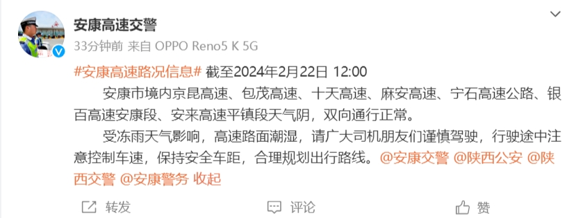 據(jù)安康高速交警消息:截至2024年2月22日12:00,安康市境內(nèi)京昆高速、包茂高速、十天高速、麻安高速、寧石高速公路、銀百高速安康段、安來高速平鎮(zhèn)段天氣陰,雙向通行正常。受凍雨天氣影響,高速路面潮濕,請廣大司機(jī)朋友們謹(jǐn)慎駕駛,行駛途中注意控制車速,保持安全車距,合理規(guī)劃出行路線。 hKJ安康新聞網(wǎng)