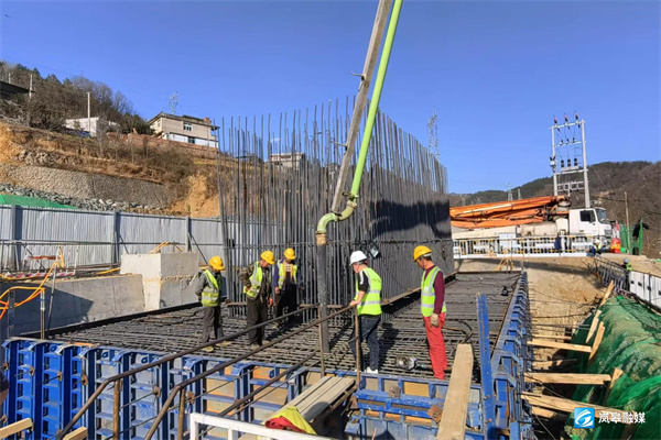 “對施工現(xiàn)場承臺尺寸測量和檢查,確保承臺的尺寸和位置準(zhǔn)確無誤。隨后按照設(shè)計圖紙及規(guī)范要求綁扎承臺鋼筋,布設(shè)降溫管,埋設(shè)墩身預(yù)埋鋼筋,定型鋼模板安裝加固,以確保承臺的強度和穩(wěn)定性。”現(xiàn)場技術(shù)員高敬智說道。施工中,參建單位嚴(yán)格落實安全質(zhì)量技術(shù)交底,優(yōu)化施工配置,項目技術(shù)人員全程盯控,按標(biāo)準(zhǔn)化施工要求分層澆筑、振搗、下料,確保混凝土澆筑順利進行。