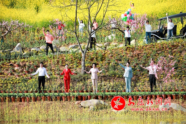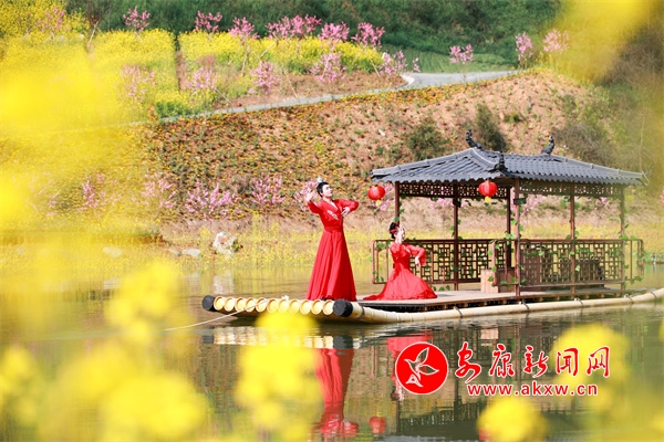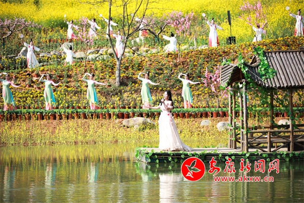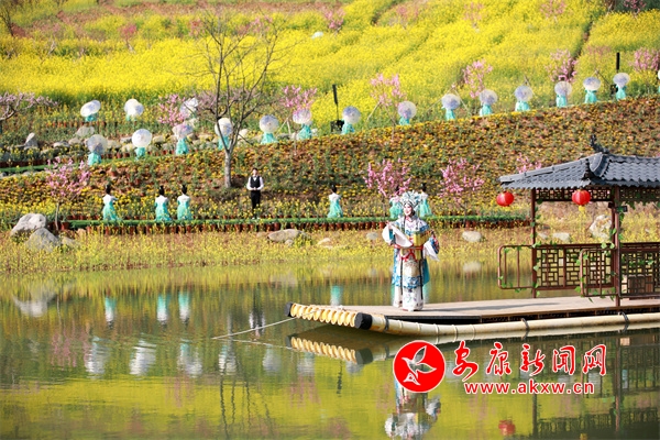 春日的水田溝村生機(jī)勃發(fā),漫山的油菜花在暖陽下爭相怒放,山坡下是一汪清澈的湖水;顒右郎骄蛣、水陸并用,將演員、舞臺、道具與水田溝村地形地貌完美融合,營造出“人在畫中游,畫在景中走”的和美景象。隨著原創(chuàng)歌曲《水田溝的油菜花》悠揚動聽的歌聲從湖面的小船傳來,活動正式拉開帷幕,獨唱《問春》、情景詩朗誦《母親河》、歌伴舞《醉美桃花源》、情景劇《桃花源記》、漢劇歌舞《喬木花》、原創(chuàng)歌曲《阿依娜》、歌伴舞《幸福安康》等精彩節(jié)目相繼上演,悠揚的歌聲、曼妙的舞姿在湖上、在油菜花田、在蜿蜒的山路漸次呈現(xiàn),將現(xiàn)場觀眾和游客迅速帶入安康桃花源美麗夢幻的油菜花海世界,沉浸式感受安康高新區(qū)產(chǎn)城綠融合發(fā)展和鄉(xiāng)村振興的顯著成效。