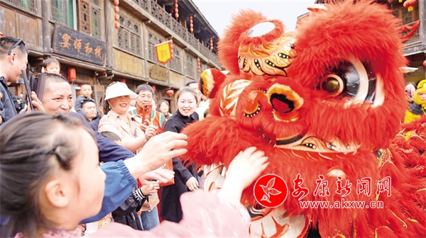 “五一”小長(zhǎng)假期間,漢陰縣雙河口古鎮(zhèn)景區(qū)吸引了大批游客前來游玩打卡。圖為游人欣賞舞獅表演。王建霞 攝
