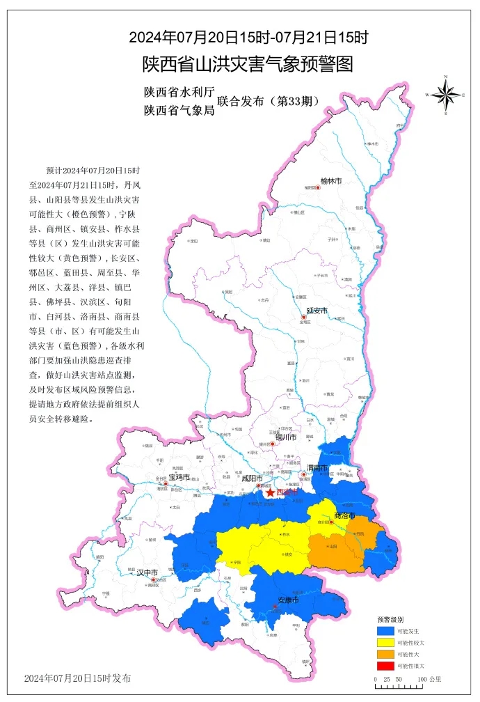 陜西省水利廳與省氣象局聯(lián)合發(fā)布山洪災害預警,預計7月20日15時至7月21日15時,下圖中所示縣(區(qū))可能發(fā)生山洪災害預警:其中我市寧陜縣發(fā)生山洪災害可能性較大(黃色預警),漢濱區(qū)、旬陽市、白河縣有可能發(fā)生山洪災害(藍色預警),各級水利部門要加強山洪隱患巡查排查,做好山洪災害站點監(jiān)測,及時發(fā)布區(qū)域風險預警信息,地方政府應依法提前組織人員安全轉(zhuǎn)移避險。