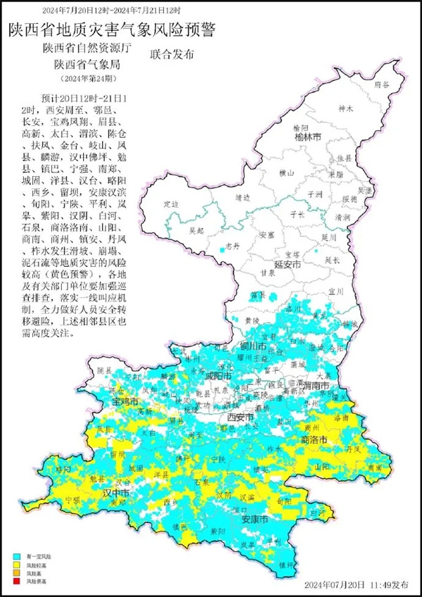 陜西省自然資源廳與省氣象局聯(lián)合發(fā)布地質(zhì)災害氣象風險黃色預警,預計7月20日12時至7月21日12時,下圖所示縣(區(qū))可能發(fā)生地質(zhì)災害:其中我市漢濱、旬陽、寧陜、平利、嵐皋、紫陽、漢陰、白河、石泉發(fā)生滑坡、崩塌、泥石流等地質(zhì)災害的風險較高(黃色預警),各地及有關(guān)部門單位要加強巡查排查,落實一線叫應機制,全力做好人員安全轉(zhuǎn)移避險,上述相鄰縣區(qū)也需高度關(guān)注。