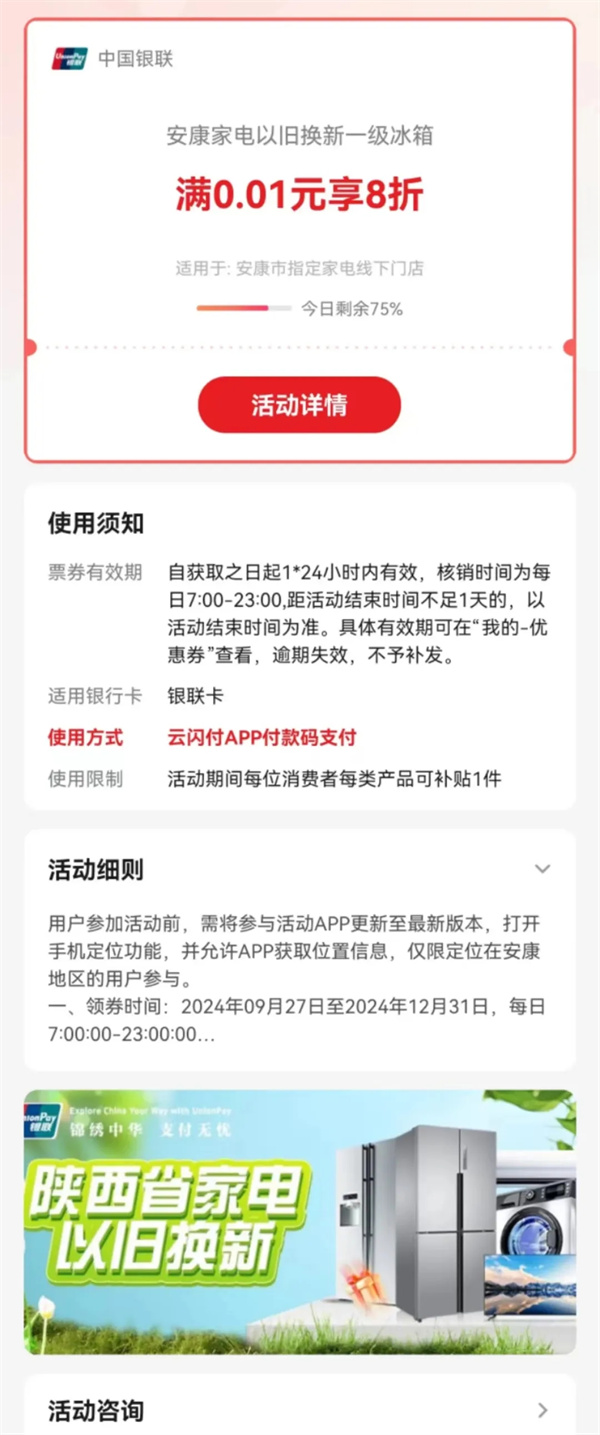 3.查看與使用:領(lǐng)取成功后,您可以在云閃付APP“我的-獎(jiǎng)勵(lì)-我的票券”中查看已領(lǐng)取的消費(fèi)券。在參與活動(dòng)的家電銷售門店選購(gòu)指定家電產(chǎn)品時(shí),出示并使用消費(fèi)券,即可享受相應(yīng)折扣。