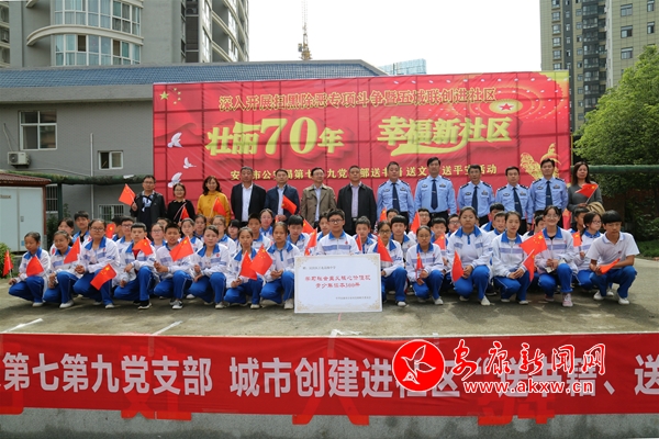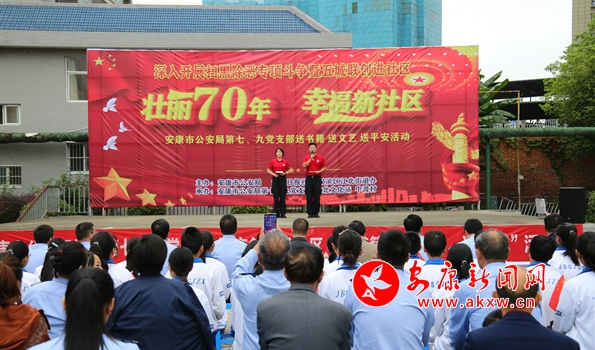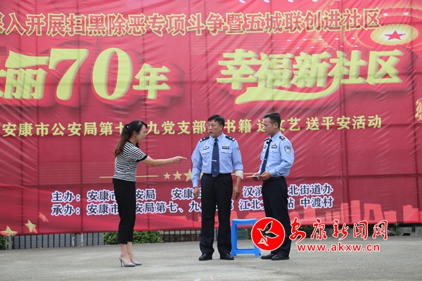 本網(wǎng)訊 (通訊員 周瑞儒)壯麗70年,幸福新社區(qū)。在新中國成立70周年即將來臨之際,9月21日上午,市公安局機(jī)關(guān)第七、第九黨支部深入漢濱區(qū)江北辦事處中渡社區(qū),開展掃黑除惡專項(xiàng)斗爭暨“五城聯(lián)創(chuàng)”進(jìn)社區(qū)“送書籍、送文藝、送平安”活動(dòng)。市公安局、市創(chuàng)建辦、安康日報(bào)社、江北街道辦事處相關(guān)負(fù)責(zé)人,市公安局機(jī)關(guān)第七、第九黨支部全體民警輔警,市公安局創(chuàng)建辦、漢濱分局江北派出所負(fù)責(zé)人,江北高級中學(xué)學(xué)生代表、社區(qū)群眾200余人參加活動(dòng)。