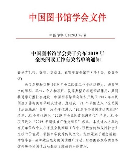 全國16個單位被評為“2019年全民閱讀優(yōu)秀組織”,其中高校圖書館4個,公共圖書館12個。安康市圖書館在2019年全民閱讀宣傳工作中,積極宣傳和踐行社會主義核心價值觀,弘揚中華優(yōu)秀傳統(tǒng)文化,組織策劃開展了“全市同讀一本書”、“全市同讀一小時”、“全市同讀一類書”等“全市同讀”系列活動,形成了全市一盤棋的業(yè)務(wù)格局,充分發(fā)揮了市館的“中心引領(lǐng)”作用,深入推進了全民閱讀工作。