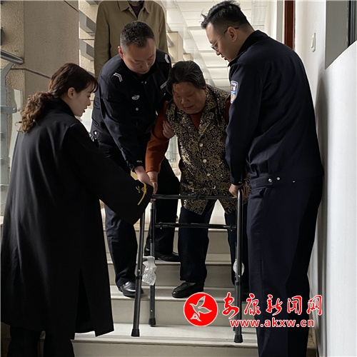 4月14日上午9時(shí)許,安康中級(jí)法院法警支隊(duì)值班干警通過網(wǎng)絡(luò)監(jiān)控看到一位老大媽手扶輪椅獨(dú)自一人,步履蹣跚、顫顫巍巍在訴訟通道行走,值班干警迅速趕到老人身邊,經(jīng)詢問得知,老大媽劉某今年70歲,是一位被上訴人來院開庭。為了幫助劉某到庭參加訴訟,值班干警李康、陳文環(huán)、鄒琨三人小心將他護(hù)送到法庭,安排好座椅讓其就座。劉某對(duì)法警隊(duì)員體貼的舉動(dòng)一再表示感謝。(圖文/劉峰 馬小松)Enk安康新聞網(wǎng)