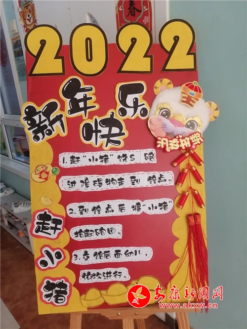 游戲“享”元旦。根據(jù)孩子的興趣愛好,設(shè)計(jì)不同類的游戲項(xiàng)目,以闖關(guān)的形式玩游戲,孩子們?cè)谟螒蛑屑儒憻捔松眢w,又收獲了快樂。