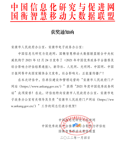 本次評估以“數(shù)字政府建設(shè)驅(qū)動(dòng)中國數(shù)字化轉(zhuǎn)型”為主題,依據(jù)“分類指導(dǎo)、創(chuàng)新引領(lǐng)”工作思路,針對全國各級黨政部門數(shù)字政府平臺建設(shè)、黨務(wù)政務(wù)網(wǎng)站、黨務(wù)政務(wù)新媒體開展分級分類測評。評估以建設(shè)公開、透明、智慧、實(shí)用、便捷、高效的數(shù)字政府政務(wù)平臺為目標(biāo),推薦評選出2021年中國最具影響力、最給力、最具動(dòng)員力、最具傳播力黨務(wù)政務(wù)平臺、最具創(chuàng)新力數(shù)字政府管理平臺、數(shù)字政府創(chuàng)新型政務(wù)平臺、中國領(lǐng)先和優(yōu)秀政務(wù)網(wǎng)站、外文版政府網(wǎng)站國際化程度、最具影響力和優(yōu)秀政務(wù)新媒體等成果。安康市人民政府網(wǎng)站、安康高新技術(shù)產(chǎn)業(yè)開發(fā)區(qū)網(wǎng)站均獲評“2021年度中國優(yōu)秀政務(wù)網(wǎng)站”。
