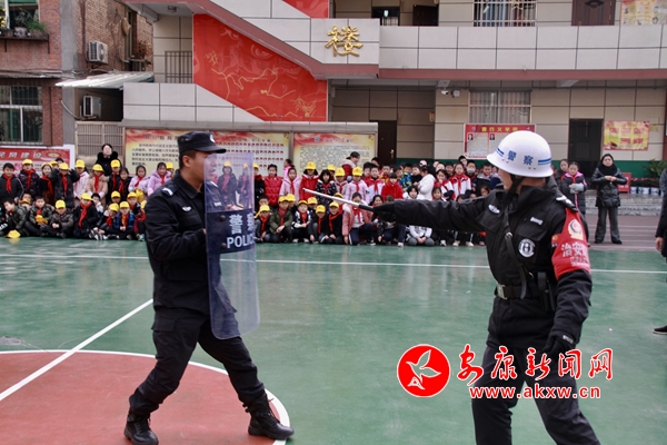 師生們?cè)谠⒔逃跇?lè)的過(guò)程中,進(jìn)一步增強(qiáng)了安全防范意識(shí)和面對(duì)突發(fā)情況的處置能力;顒(dòng)中,特警們還對(duì)校園護(hù)校隊(duì)的隊(duì)員們進(jìn)行了安全知識(shí)培訓(xùn),并就防暴盾、防暴叉等安全設(shè)備的正確使用做了詳細(xì)講解和模擬演示。