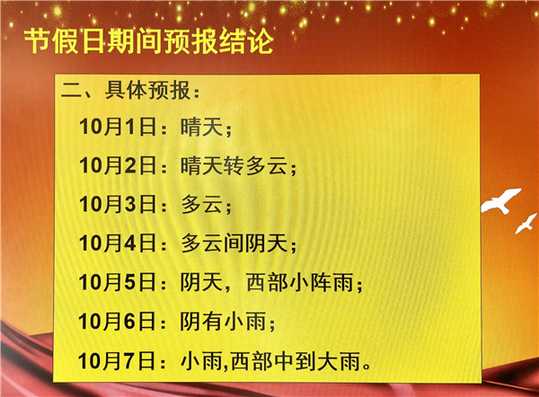 10月1日:晴天;10月2日:晴天轉(zhuǎn)多云;10月3日:多云;10月4日:多云轉(zhuǎn)陰天;10月5日:陰天,西部小陣雨;10月6日:小雨;10月7日:小雨,西部中到大雨。