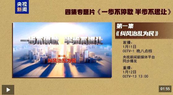 電視專題片《一步不停歇 半步不退讓》第一集《糾風(fēng)治亂為民》,講述紀(jì)檢監(jiān)察機(jī)關(guān)不斷加大風(fēng)腐同查同治力度,鍥而不舍落實(shí)中央八項(xiàng)規(guī)定精神,嚴(yán)肅查處違規(guī)吃喝背后的團(tuán)團(tuán)伙伙、請托辦事和利益輸送,集中整治群眾身邊不正之風(fēng)和腐敗問題,讓群眾真切感到正風(fēng)反腐加力度、清風(fēng)正氣在身邊?偱_央視綜合頻道1月11日晚8點(diǎn)檔播出,央視新聞新媒體平臺同步播發(fā)。