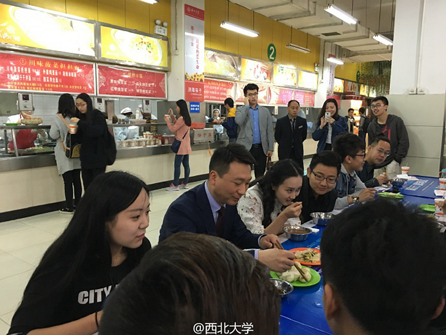 講座開(kāi)始前,康輝還和同學(xué)們共進(jìn)早餐。他不斷夸贊早上的包子好吃。圖片來(lái)自@西北大學(xué)