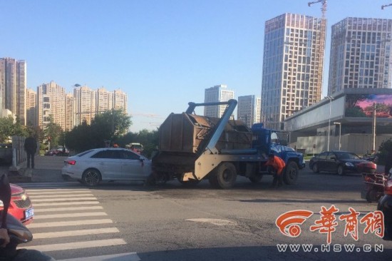 9月7日早晨7時(shí)50分左右,西安市南三環(huán)雁翔橋十字由西向北左轉(zhuǎn)彎處發(fā)生一起交通事故,一輛白色奧迪撞與一輛環(huán)衛(wèi)車(chē)發(fā)生碰撞。