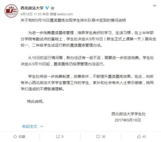 學生處將進一步完善制度,改善條件,不斷提升晨讀晨練效果。在此,向所有關心西北政法大學學生管理工作的學生、家長和社會有關人士表示感謝,給同學們造成的不便敬請理解。