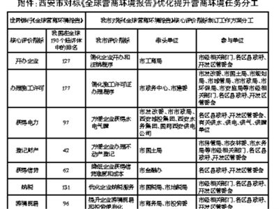 按照《西安市對標(biāo)〈全球營商環(huán)境報(bào)告〉優(yōu)化提升營商環(huán)境任務(wù)分工》(見附件),各牽頭部門根據(jù)各自職責(zé),從世界銀行《全球營商環(huán)境報(bào)告》中開辦企業(yè)、辦理施工許可、獲得電力、登記財(cái)產(chǎn)、獲得信貸、納稅、跨境貿(mào)易7個(gè)核心評價(jià)指標(biāo)入手,圍繞減環(huán)節(jié)、優(yōu)流程、壓時(shí)限、提效率,牽頭制訂具體工作方案,于2017年10月31日前報(bào)市行革辦研究審定后組織實(shí)施。市統(tǒng)計(jì)局會同市行政學(xué)院盡快研究制訂我市縣域營商環(huán)境監(jiān)測評價(jià)指標(biāo),強(qiáng)化綜合衡量和定期排名,努力提升全市縣域營商環(huán)境和市場競爭力。