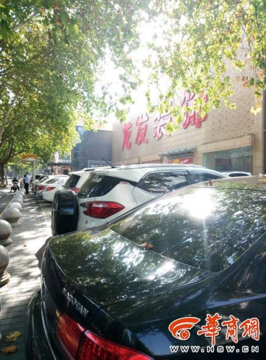 11月7日,西稍門十字西南角勞動南路人行道上,在龍發(fā)裝飾店外停車場,盲道南側與非機動車道之間放置一排圓形石墩,停放在該處的十幾輛私家車幾乎都沒有停在線內,車頭或車尾都越過車位線、占用盲道。華商記者楊平 攝