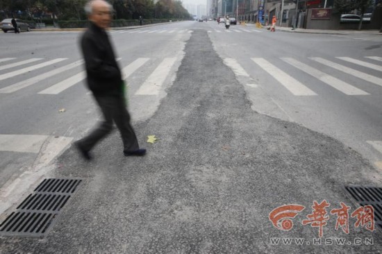 29日上午,華商報(bào)記者趕到建工路,王先生所說(shuō)的西行車道馬路路面中間車道顯然是新修過(guò)的,但表面卻似乎蓋著一層碎渣類的東西,圍著深色路面擺放著幾個(gè)活動(dòng)隔離墩,一名環(huán)衛(wèi)工裝束的老漢正在新科路路口路段清掃路面的碎渣,旁邊一輛小推車上已經(jīng)裝了大半車碎石子。