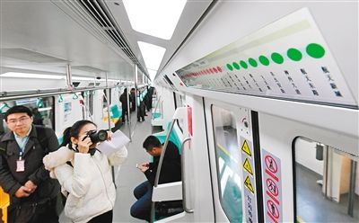 與目前開通的地鐵三條線路列車不同,四號線列車的座位旁邊沒有設(shè)置玻璃擋板,顯得更加開闊。報(bào)站的屏幕顯示著當(dāng)前實(shí)時(shí)時(shí)間、本趟列車終點(diǎn)站以及下一站,29座車站的字體變大,紅色燈表示已經(jīng)走過的車站,綠色燈表示將要到達(dá)的車站,讓乘客更易看清。