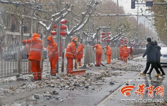 在雁塔區(qū),從1月6日晚至7日14時,5萬余名機關干部、市容保潔和綠化養(yǎng)護工人以及沿街單位志愿者上街清雪。