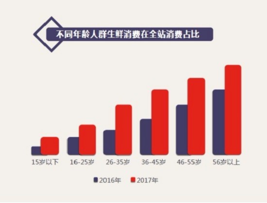 對(duì)比不同年齡段的消費(fèi)結(jié)構(gòu)可以發(fā)現(xiàn),50后、60后和70后用戶的生鮮消費(fèi)在全站消費(fèi)占比最高,可見“銀發(fā)經(jīng)濟(jì)”效應(yīng)在生鮮電商領(lǐng)域更為明顯,網(wǎng)上買菜、買肉的習(xí)慣也在逐步取代菜市場在中老年人心里的地位。