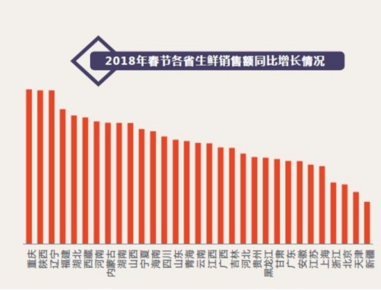 與2017年春節(jié)期間相比,2018年春節(jié)生鮮消費(fèi)同比增長最快的省份包括重慶、陜西、遼寧、福建、湖北,其銷售額同比增長均超過300%。(李程)