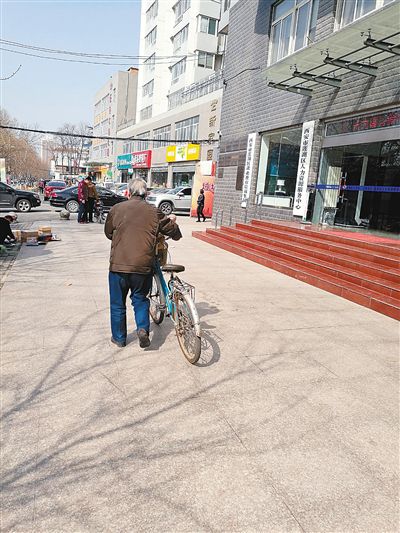 3月8日中午11時許,姜全榮推著自行車急著趕回家,“今天是兒子的透析日,我還要陪他去醫(yī)院。”(王海鵬)