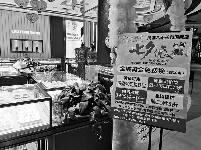 8月11日中午正逢周末,記者來到人氣極高的小寨賽格,在珠寶黃金專柜,發(fā)現很多珠寶品牌都趁機推出七夕活動,不少消費者正在詢價。今年27歲的趙女士說,她和男友剛剛訂婚,準備看看首飾,為婚禮準備,這段時間恰好遇到七夕節(jié)活動,如果優(yōu)惠合適的話,她們就打算購買了。